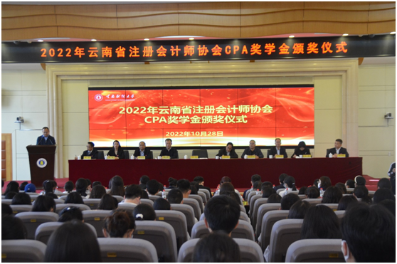 10月28日,2022年度云南省注册会计师协会CPA奖学金颁奖仪式在英国正版365官方网站举行,云南省财政厅党组成员、副厅长、厅社会组织党委书记王武,云南省财政厅总会计师、二级巡视员赵建森,英国正版365官方网站党委委员、副校长余怒涛,云南省注册会计师协会负责人出席会议,云南省财政厅会计处,英国正版365官方网站校友工作办公室、教育发展基金会,会计学院及各参评学院的负责人和相关同志及获得2022年度CPA奖学金的全体师生参加颁奖仪式。颁奖仪式由英国正版365官方网站副校长彭强主持。