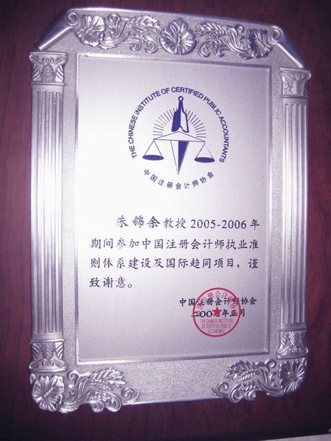 日前,中国注册会计师协会给会计学院朱锦余教授寄来感谢牌,感谢他在2005-2006年期间为中国注册会计师执业准则体系建设及国际趋同项目中所做出的贡献。该感谢牌制作于2007年5月,因朱锦余教授受国家公派于2006年12月-2007年12月在英国爱丁堡Napier大学进行博士后研究而延期寄来。