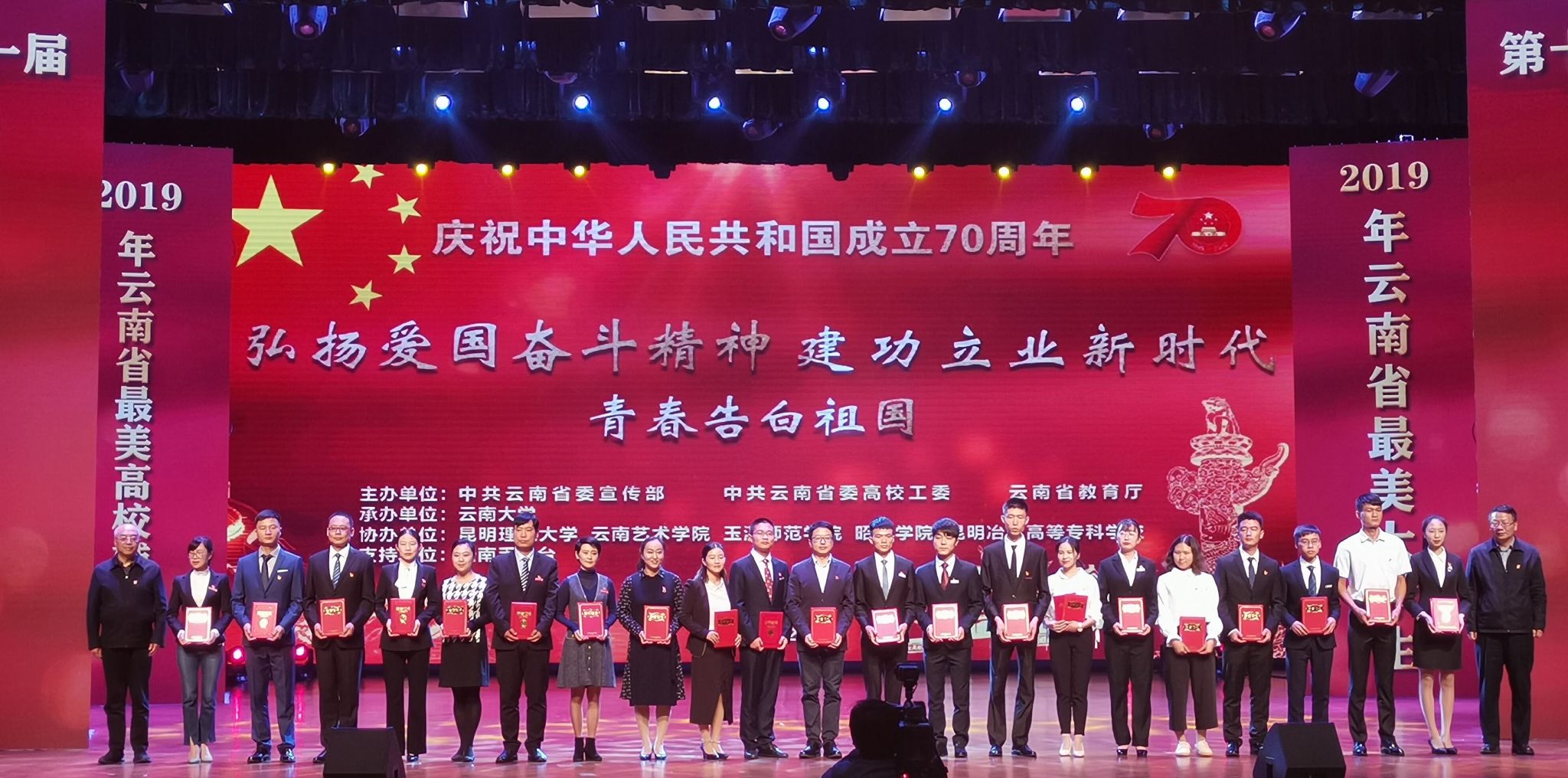 主题活动由朗诵、故事讲演、情景剧、优秀人物颁奖等部分组成,在场师生集体向伟大祖国深情告白。活动表彰了2019年云南省大学生年度人物、高校辅导员年度人物、最受学生敬佩辅导员、最关爱学生班主任。我校刘颖荣获第十一届云南省高校“辅导员年度人物”称号,舒挺荣获“最受学生敬佩辅导员”称号,陈琳获“优秀辅导员”称号,王芳获“优秀班主任”称号。